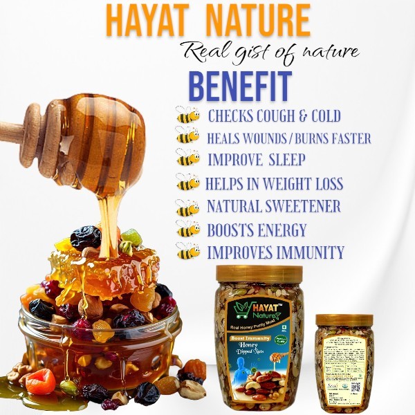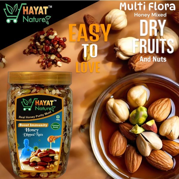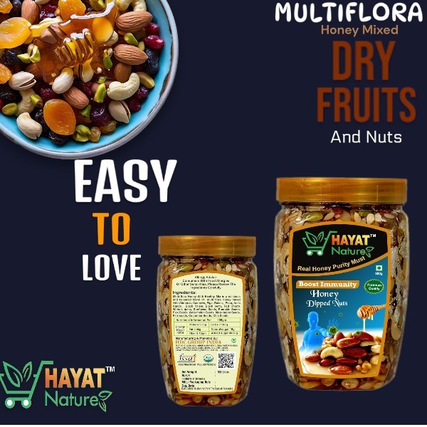 • Hayat Nature Multiflora honey mixed nuts and dry fruits- Snack Anytime, Anywhere - Morning, evening, or mid-day keep your cravings at bay with this scrumptious all-day mix. Honey With Health Mix is a wholesome snack for your active lifestyle to keep you going, without weighing you down.