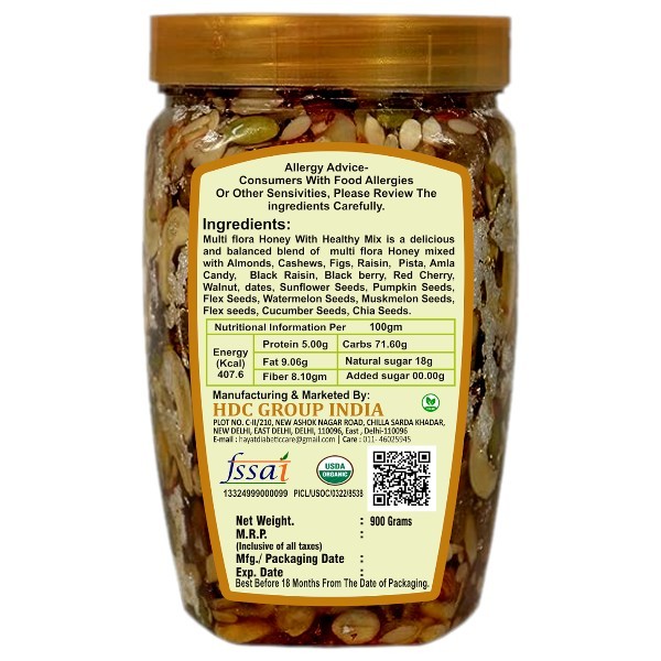 • 1A Mouthful of Nutrition - Wholesome First Multiflora Honey With Healthy Mix is a delicious and balanced blend of Kashmiri Honey mixed with Almonds, Cashews, Raisin, Black Raisin, Black berry, Read Cherry, Walnut, dates, Sunflower Seeds, Pumpkin Seeds, Flex Seeds, Watermelon Seeds, Muskmelon Seeds, Flex seeds, Cucumber Seeds, and Medzool Dates Gross Wt. 900gm, Package Wt 1kg.