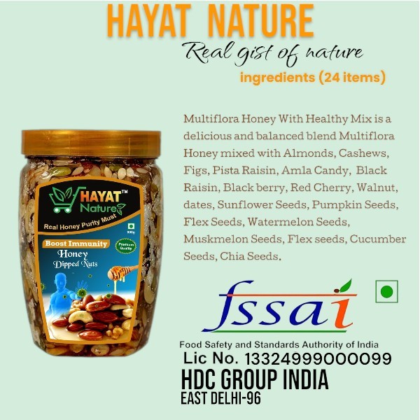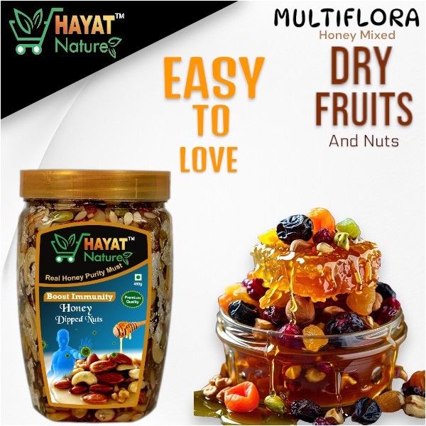 • Hayat Nature Multiflora honey mixed nuts and dry fruits- Snack Anytime, Anywhere - Morning, evening, or mid-day keep your cravings at bay with this scrumptious all-day mix. Honey With Health Mix is a wholesome snack for your active lifestyle to keep you going, without weighing you down.