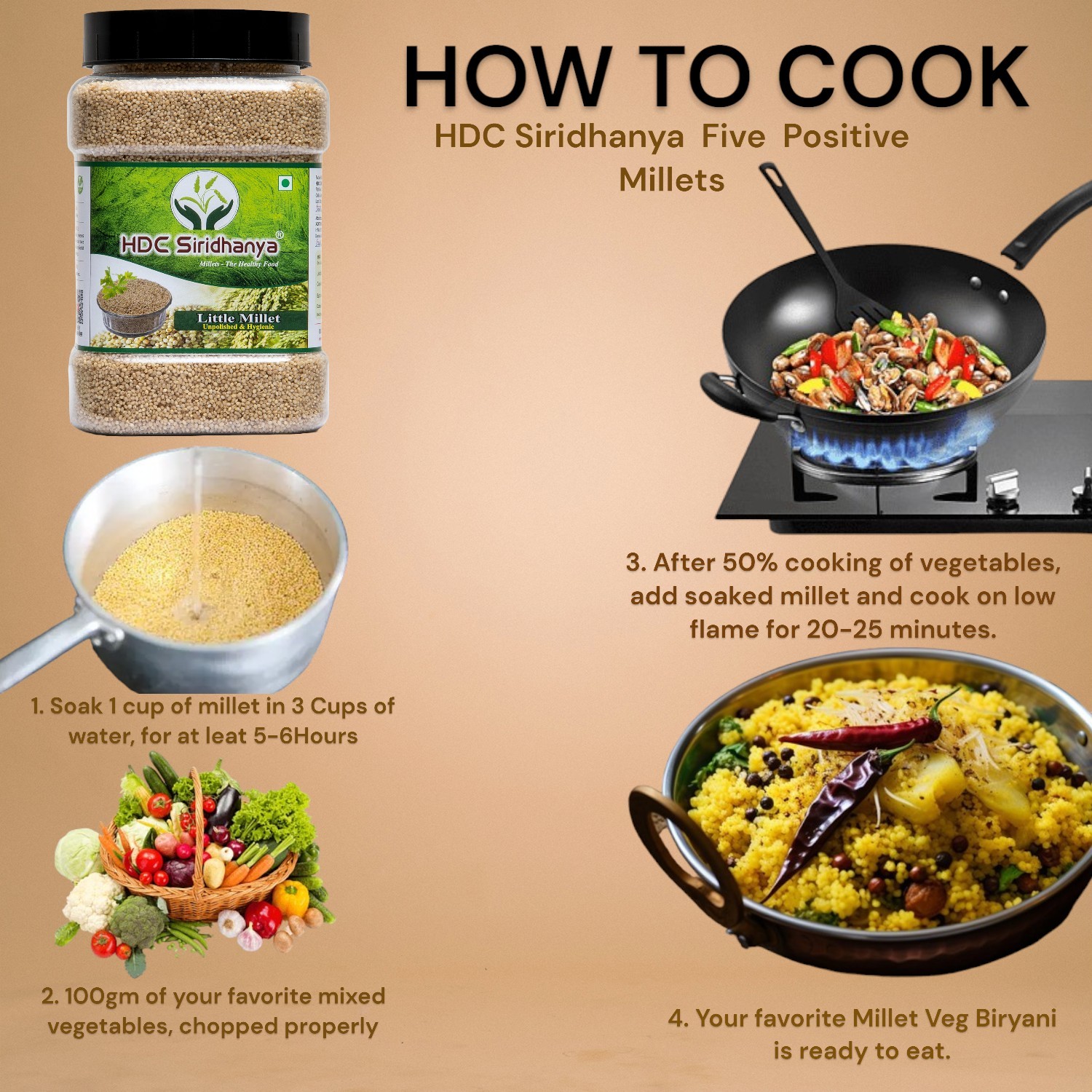 - Instruction: (a) Soaking is necessary of Siridhanya millets makes it easier to digest and allows your body to absorb more nutrients. Simply soak your millet in 3 times the amount of water for at least 5-6 hours. (b) Cook the proper way 20-30 minutes in medium flame.