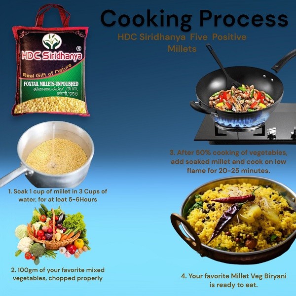 - Instruction: (a) Soaking is necessary of Siridhanya millets makes it easier to digest and allows your body to absorb more nutrients. Simply soak your millet in 3 times the amount of water for at least 5-6 hours. (b) Cook the proper way 20-30 minutes in medium flame.